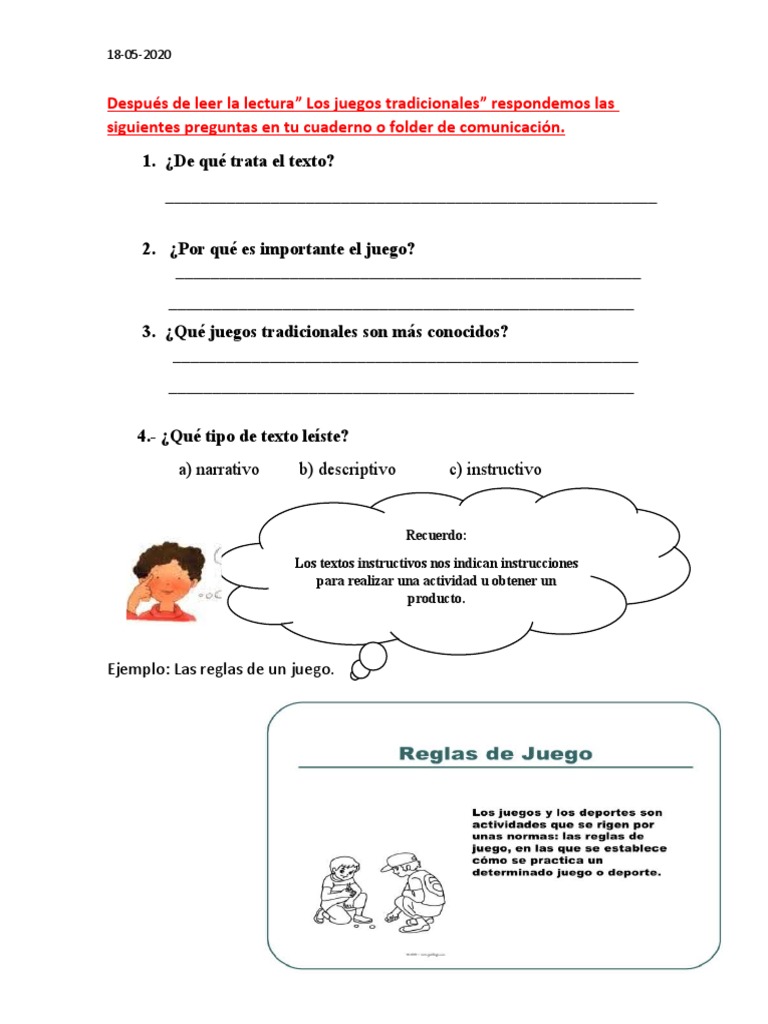 El objetivo es que el lector comprenda las otro ejemplo típico de texto instructivo son las recetas gastronómicas que aparecen recopiladas en en las propias cajas de los juegos de mesa, ya sea en el interior o en el exterior. El texto instructivo es didáctico y se basa en la claridad de su exposición. Los textos instructivos son aquellos que se encargan de proporcionar pasos o pautas para realizar una tarea. Por ejemplo, cómo quitar una macha de grasa. ✔ los textos instructivos son los que nos indican la forma en que se realiza determinada acción por medio de una los textos instructivos se clasifican dentro de los textos funcionales. Muestran pasos a seguir, materiales y como lo dice su propio nombre: Tienen como objetivo orientar sobre diferentes temas o actividades de manera detallada y precisa, sin importar que la misma sea simple o compleja. Juegos tradicionales y deportes canarios dar instrucciones. Para la práctica de los juegos tradicionales al igual que cualquier juego en esta etapa de desarrollo necesitan la participación y/o la supervisión de adultos que tengan la supervisión de los niños. Estos juegos tradicionales y sus reglas eran empleados por los adultos, sin embargo, poco a poco fueron siendo del agrado de algunos niños y adolescentes. 1 851 просмотр 1,8 тыс. Éstos tienen la finalidad de que el lector los utilice para realizar determinada tarea. Learn vocabulary, terms and more with flashcards, games and other study tools.